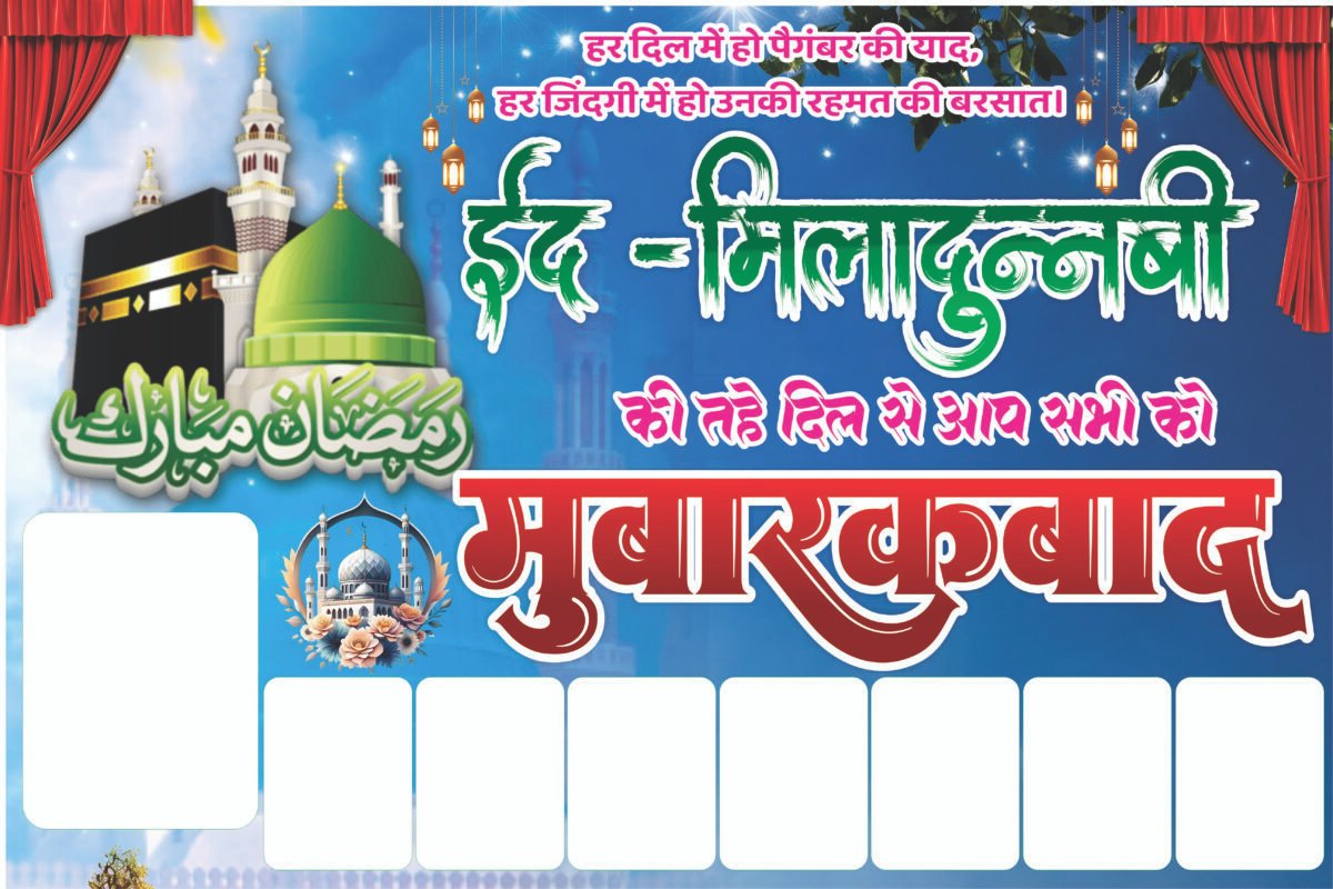 Culturally, Jashne Eid Milad un Nabi fosters a sense of unity among Muslims, regardless of their background or nationality. Communities come together to honor the life and legacy of the Prophet, and this often includes public processions, feasts, and the decoration of homes and places of worship. One of the most visually striking aspects of the celebration is the use of banners and decorations that reflect the spirit of the event. These visually appealing designs often incorporate Islamic motifs, colorful patterns, and calligraphy that highlight verses from the Quran or praises of the Prophet (PBUH).