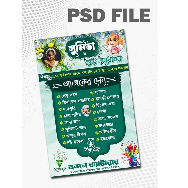 Our PSD template offers a seamless blend of traditional cultural elements and modern utility. The design reflects the essence of Bengali heritage, featuring intricate patterns, rich colors, and elegant fonts that complement the Annaprashan theme. Whether you’re serving a grand feast or a simple celebratory menu, this template can be personalized to list all the dishes while impressing your guests with its sophistication.