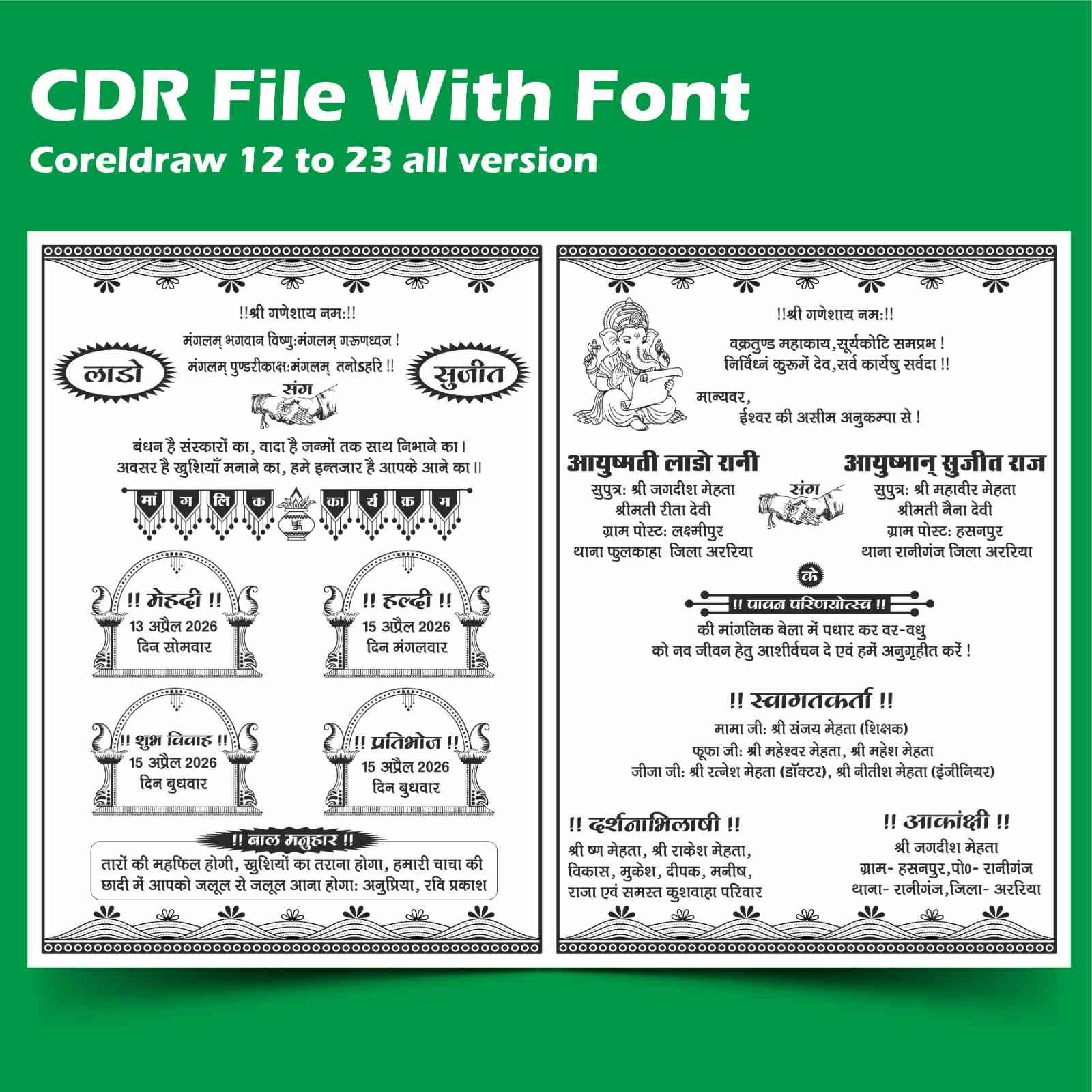•New hindu wedding card If you buy this file, you will get Coreldraw file along with fonts. You can fully edit this file.